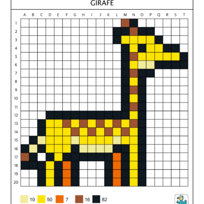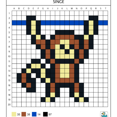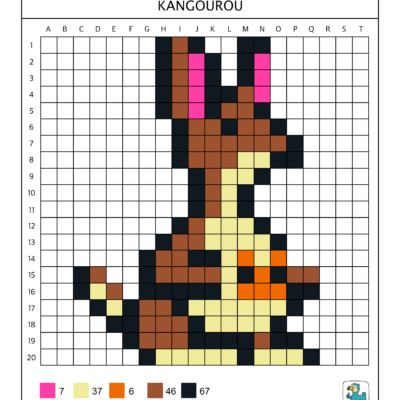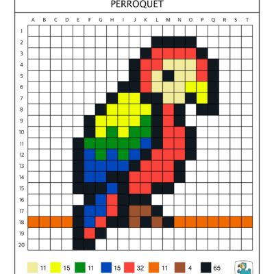 4 modèles de pixel art 20×20 sur le thème des animaux : perroquet, kangourou, girafe et singe.