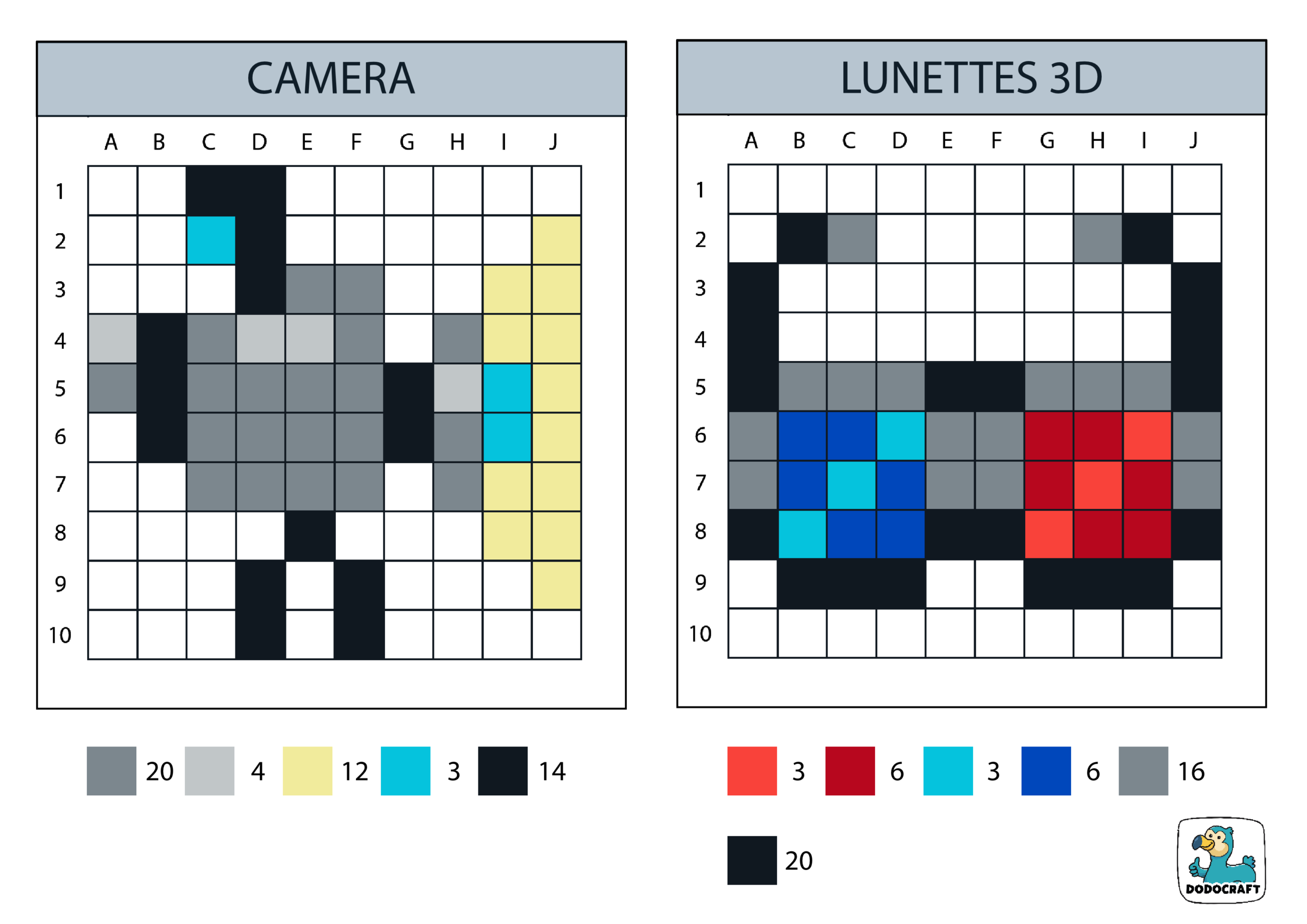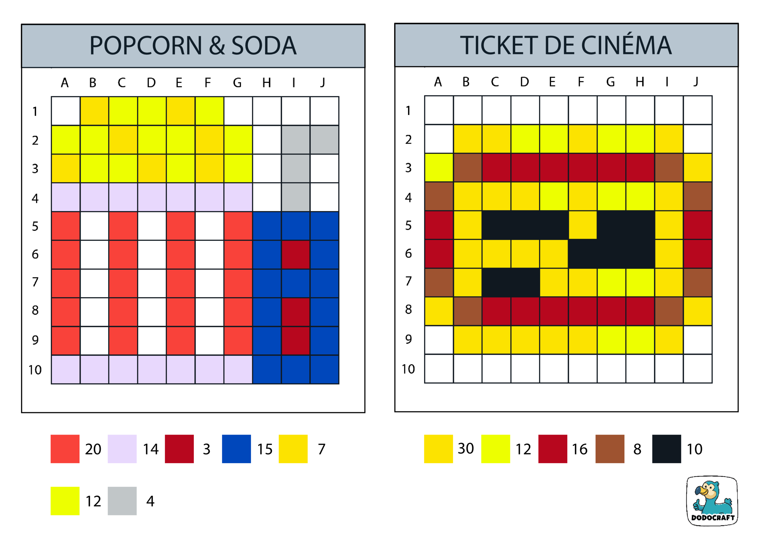 6 modèles 10×10 à réaliser avec les nouvelles couleurs de pixels sur le thème du cinéma.